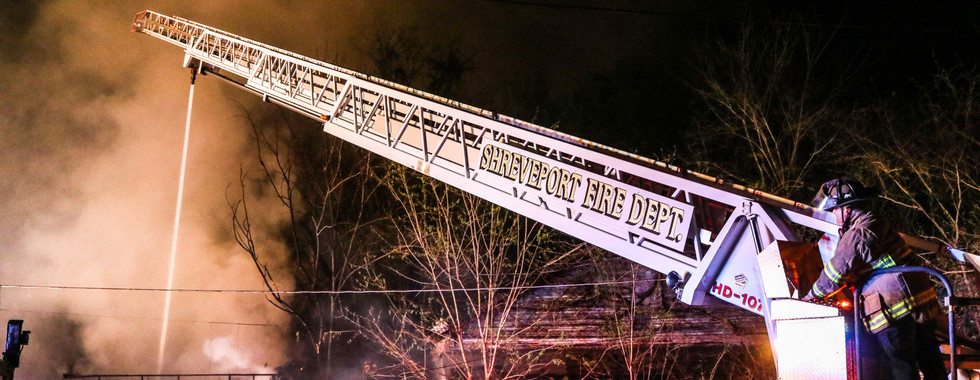SHREVEPORT, LA - Around 9:15pm Shreveport Fire Department crews responded to the intersection of Travis Street and Schumpert Street for reports of two houses on fire with smoke and flames visible. While crews were enroute units updated dispatch to advise of heavy smoke in the area. Upon arrival crews found one home fully involved with houses on each side also catching fire. Firefighters immediately began an exterior fire attack while crews started laying a supply line to the closest fire hydrant. A deck gun from an engine company and also a ladder truck was used to help douse the flames and reach the hard to get spots. This 1200 block of Travis Street has "shot-gun" style homes which are skinny, long and placed closely together. All homes appeared to be abandoned and in inhospitable conditions. The cause of the fire is under investigation and no injuries were reported. Signal 51 units responded and served over a bag of rehab supplies.